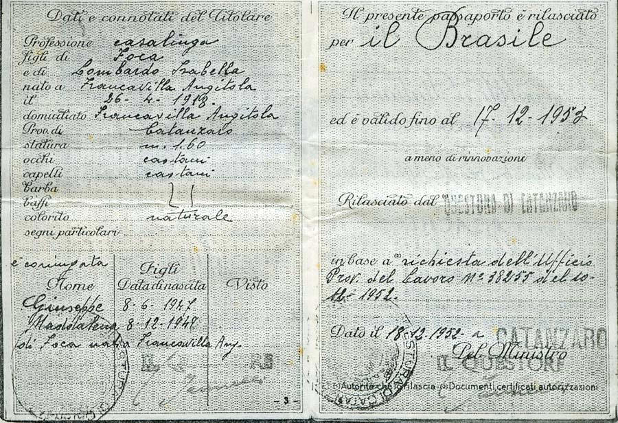 Proprio in quegli anni e precisamente nel 1948, fu Rosario De Caria di professione musicista, a riaprire la strada verso il Brasile e fu lui, si dice, dopo essersi sposato con Julia Patti a combinare il matrimonio di Totò Farina con la sorella della moglie Flora Patti, entrambe brasiliane. Seguirono poi gli altri fratelli Farina, Vincenzo Nicola sposatosi con Silvia Attala, Maria che si sposò nel 1952 con un brasilero di nome Armando Vittilo e Foca Alfredo, marito di Nina Aracri che raggiunse il consorte un paio di anni dopo, precisamente nel giugno del 1953.