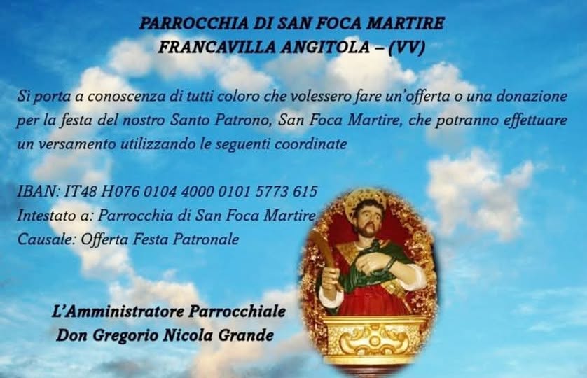 È doveroso come Parrocchia ringraziare quanti hanno contribuito alla buona riuscita della nostra Festa Patronale di San Foca Martire...in primis grazie a Don Gregorio Grande che ha saputo essere una preziosa guida spirituale e di aggregazione anche nei momenti di maggior stanchezza e difficoltà, con cui insieme abbiamo ritrovato il senso di fraternità e di preghiera che ci mancava da molto tempo, il senso del servizio e dell'accoglienza non escludendo nessuno e facendo sì che la nostra comunità di San Foca possa crescere come testimonianza di fede e di amore verso Gesù e verso i fratelli volendo essere una famiglia unita e accogliente per camminare insieme e per essere segno di speranza, di amore e di carità.