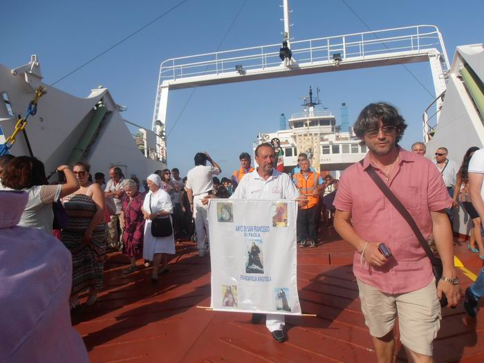 Fortunato MARINO, Priore e Governatore della confraternita messinese intitolata al Santo di Paola, a nome della città dello Stretto e della Sicilia, ha rivolto alle migliaia di fedeli astanti sulla spiaggia e sul lungomare un affettuoso e vibrante discorso di calorosa accoglienza. Dando lettura di uno speciale messaggio inviato da Mons. SORICELLI, arcivescovo di Amalfi, il Priore ha elogiato i devoti a San Francesco di fuori Sicilia, sia quelli presenti di persona (i calabresi), sia quelli di Campania, fisicamente lontani, ma vicini spiritualmente. Poi ha preso la parola Antonino SAMIANI, Comandante della Capitaneria di Porto di Messina, esaltando San Francesco di Paola come celeste Patrono della Gente di Mare. Quindi si è avviata la processione lungo le strade della V Circoscrizione “Antonello da Messina” dove c’è la Parrocchia Santa Maria dell’Arco, presso il punto in cui San Francesco approdò. Al gruppo di Francavilla Angitola è stato concesso l’onore di avere il primo posto del lungo corteo; il corteo si apriva con la statuina del Santo sulla “Barchetta di Benincasa” e si chiudeva con la grande statua proveniente da Catona. Spiccavano nella processione gli stendardi e le uniformi di gala indossate da uomini e donne, fedeli e terziari, di Confraternite e T.O.M. (Terzo Ordine Minimo) provenienti da tutta la Sicilia: San Giuseppe Jato, Castellana Sicula, Trapani, Valguarnera Caropepe, Palermo, Barcellona Pozzo di Gotto, Milazzo, Messina; insieme a loro, gli stendardi e i terziari calabresi di Catona, Casabona e Paola. Era presente